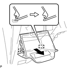 (d) Déposer le porte-gobelet du tableau de bord en le bougeant soit vers l'intérieur, soit vers l'extérieur du véhicule et libérer les 2 charnières l'une après l'autre. |