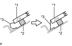 (1) A l'aide d'un couteau, couper toute aspérité formée par le produit adhésif sur la surface de contact de la carrosserie du véhicule afin de façonner la surface. CONSEIL: Laisser le plus de produit adhésif possible sur la carrosserie du véhicule. (2) Nettoyer la surface de contact de la carrosserie du véhicule avec un morceau de tissu imbibé de produit de nettoyage. |